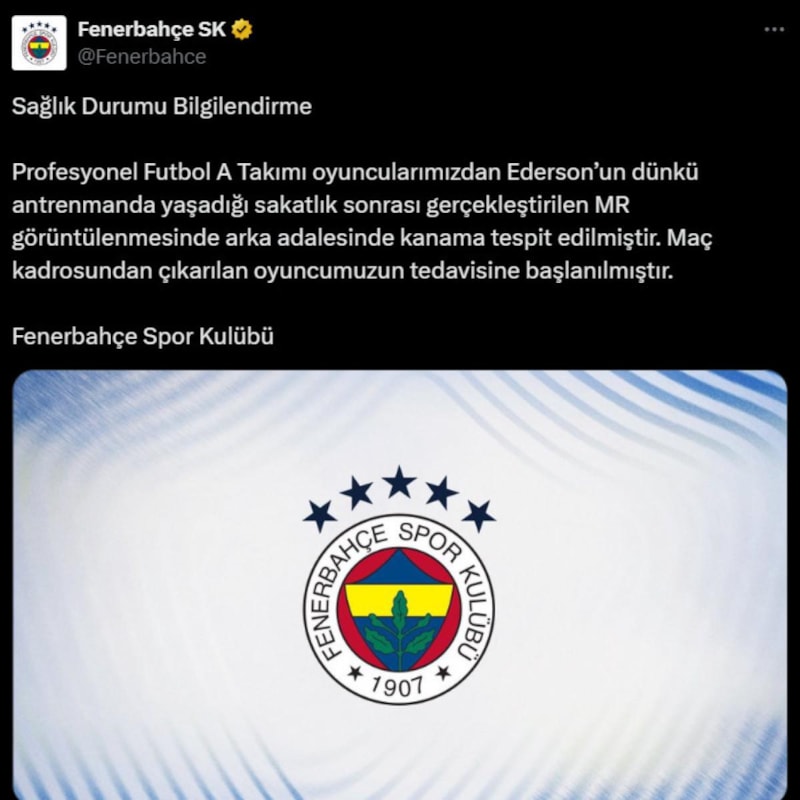 Fenerbahçe Kulübü, Brezilyalı kaleci Ederson'un antrenmanda sakatlandığını duyurdu. Sarı-lacivertli takımda Samsunspor maçında Tarık Çetin görev aldı.
