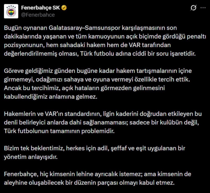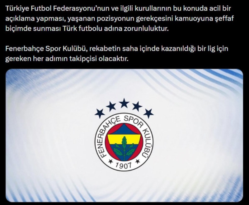 Saran'ın bu talebinin ardından Fenerbahçe Kulübü de sosyal medya hesaplarından maçın son dakikalarındaki tartışmalı pozisyonlarla ilgili açıklama geldi.