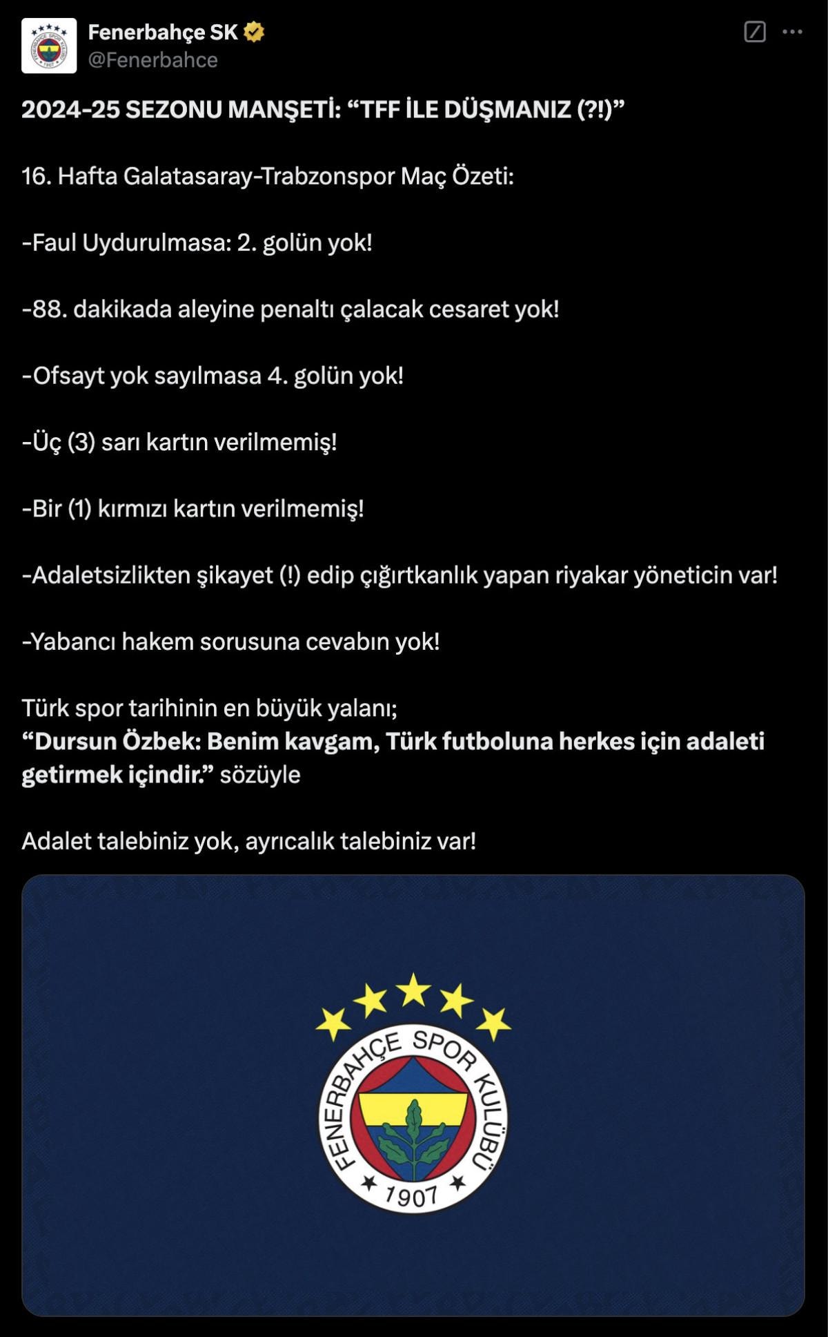 Maçın ardından ise Fenerbahçe Kulübü'nden çarpıcı bir paylaşım geldi. Sarı-lacivertliler, yayınladığı gönderide Galatasaray'ı sert bir biçimde eleştirdi.