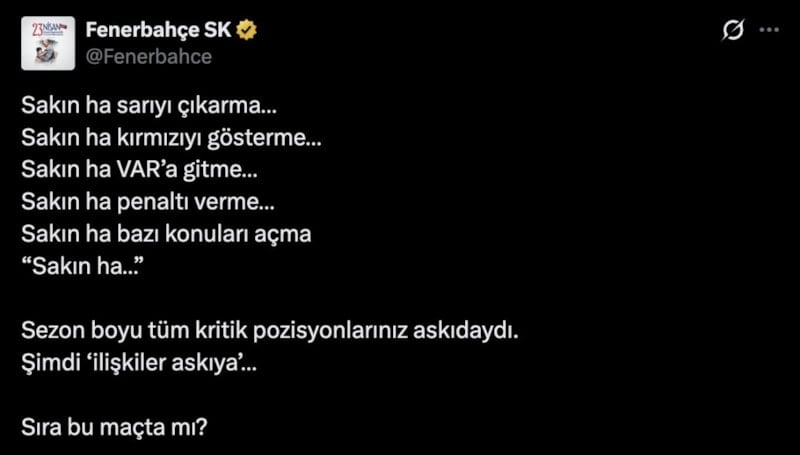 Fenerbahçe, Galatasaray'ın derbinin hakem atamasıyla ilgili yaptığı paylaşıma yanıt verdi. Sarı-lacivertlilerden yapılan paylaşımda, "Sezon boyu tüm kritik pozisyonlarınız askıdaydı. Şimdi ‘ilişkiler askıya’… Sıra bu maçta mı?" ifadeleri yer aldı.