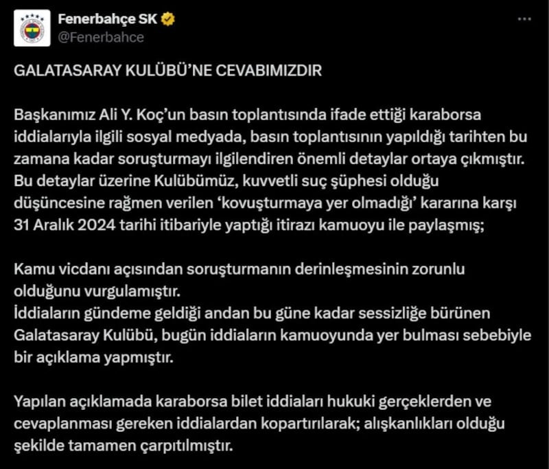 Fenerbahçe Kulübü, Galatasaray Kulübü'ne "karaborsa bilet" iddiaları hakkında bir cevap verdi.
