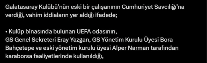 Galatasaray Kulübü’nün eski bir çalışanının Cumhuriyet Savcılığı’na verdiği, vahim iddiaların yer aldığı ifadede;