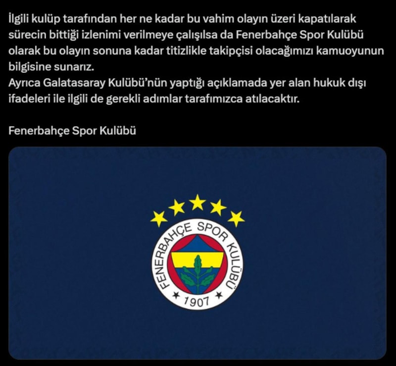İlgili kulüp tarafından her ne kadar bu vahim olayın üzeri kapatılarak sürecin bittiği izlenimi verilmeye çalışılsa da Fenerbahçe Spor Kulübü olarak bu olayın sonuna kadar titizlikle takipçisi olacağımızı kamuoyunun bilgisine sunarız.