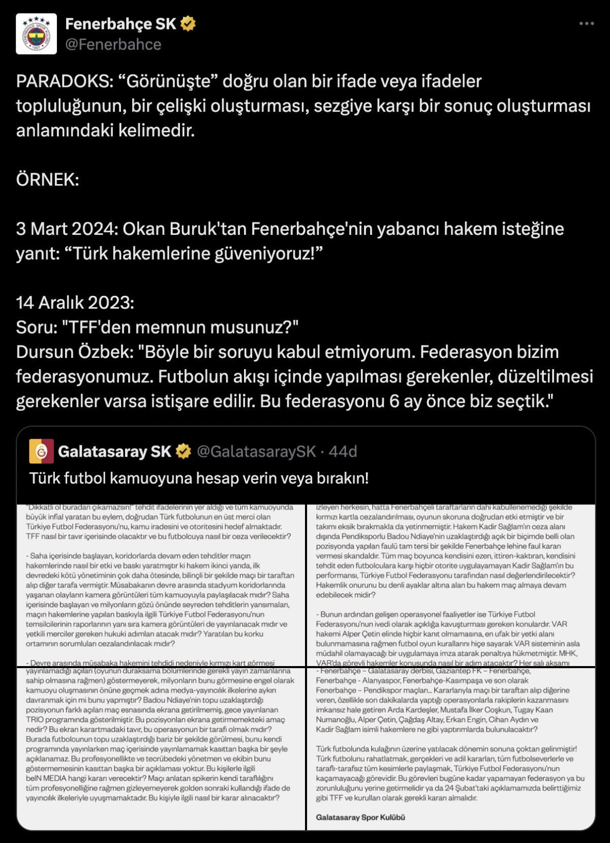 Sarı-lacivertlilerin sosyal medya hesabından yapılan paylaşımda, paradoksun tanımı yapıldı ve örnek olarak Okan Buruk ve Dursun Özbek'in hakemler ve TFF ile ilgili farklı tarihlerdeki açıklamalarına yer verildi.