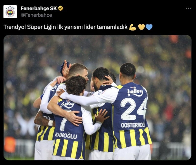 Fenerbahçe, ezeli rakibi Galatasaray'ın Süper Lig'in 16. hafta erteleme maçında Sivasspor'la 1-1 berabere kalmasının ardından paylaşım yaptı. Sarı-lacivertliler, bu paylaşımında ligin ilk yarısını lider bitirmenin vurgusunu yaptı.