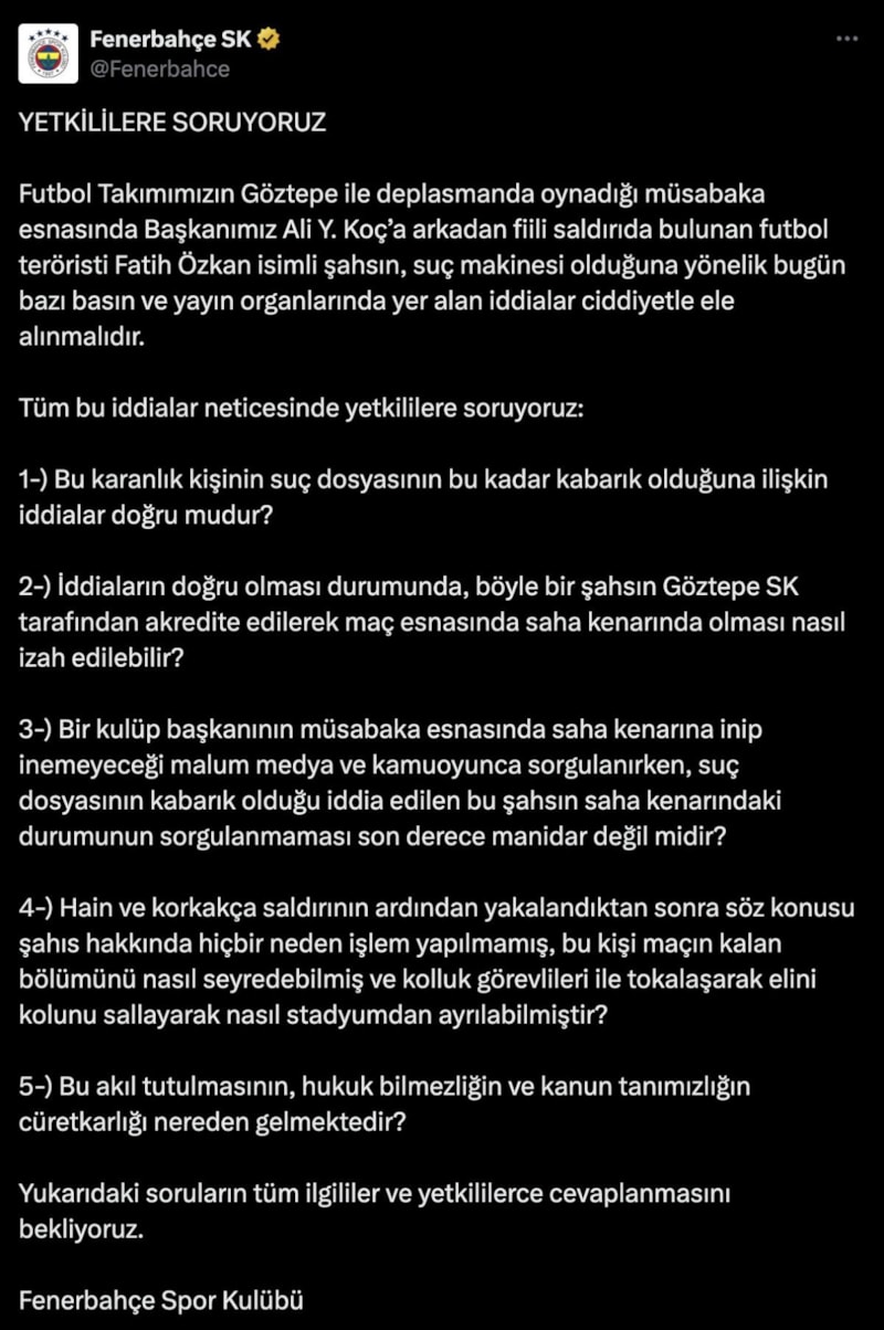Futbol Takımımızın Göztepe ile deplasmanda oynadığı müsabaka esnasında Başkanımız Ali Y. Koç’a arkadan fiili saldırıda bulunan futbol teröristi Fatih Özkan isimli şahsın, suç makinesi olduğuna yönelik bugün bazı basın ve yayın organlarında yer alan iddialar ciddiyetle ele alınmalıdır.