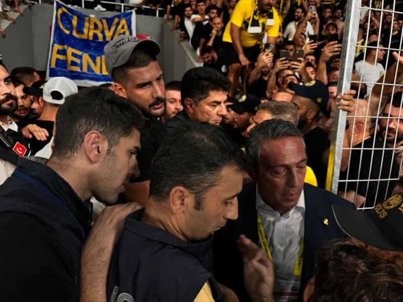Güvenlik önlemleri altında tribünden ayrılarak oyuncuların çıkış tüneline hareket eden Başkan Koç'a tribünlerden şişe ve yabancı maddeler atıldı.