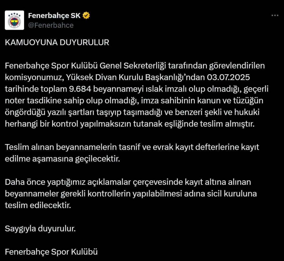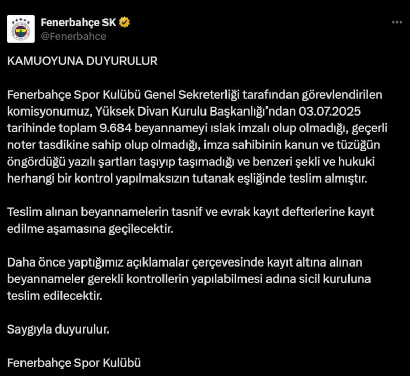 Fenerbahçe Spor Kulübü Genel Sekreterliği tarafından görevlendirilen komisyonumuz, Yüksek Divan Kurulu Başkanlığı’ndan 03.07.2025 tarihinde toplam 9.684 beyannameyi ıslak imzalı olup olmadığı, geçerli noter tasdikine sahip olup olmadığı, imza sahibinin kanun ve tüzüğün öngördüğü yazılı şartları taşıyıp taşımadığı ve benzeri şekli ve hukuki herhangi bir kontrol yapılmaksızın tutanak eşliğinde teslim almıştır.