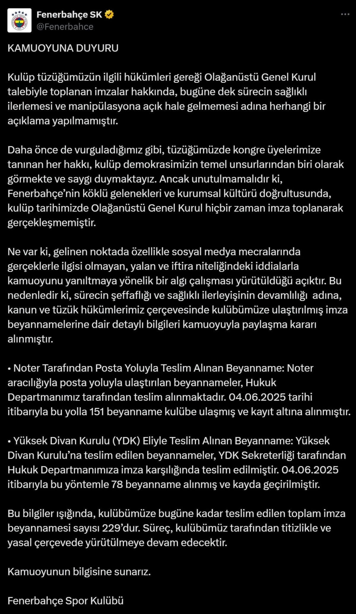 Sarı-lacivertliler, olağanüstü genel kurul talebiyle ilgili noter tarafından posta yoluyla 151, yüksek divan kurulu eliyle teslim alınan 78 beyanname olduğunu belirterek toplam sayının 229 olduğunu duyurdu.
