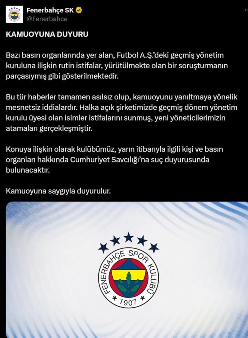 Fenerbahçe, asılsız iddialar hakkında Cumhuriyet Savcılığı'na suç duyurusunda bulunacağını açıkladı.