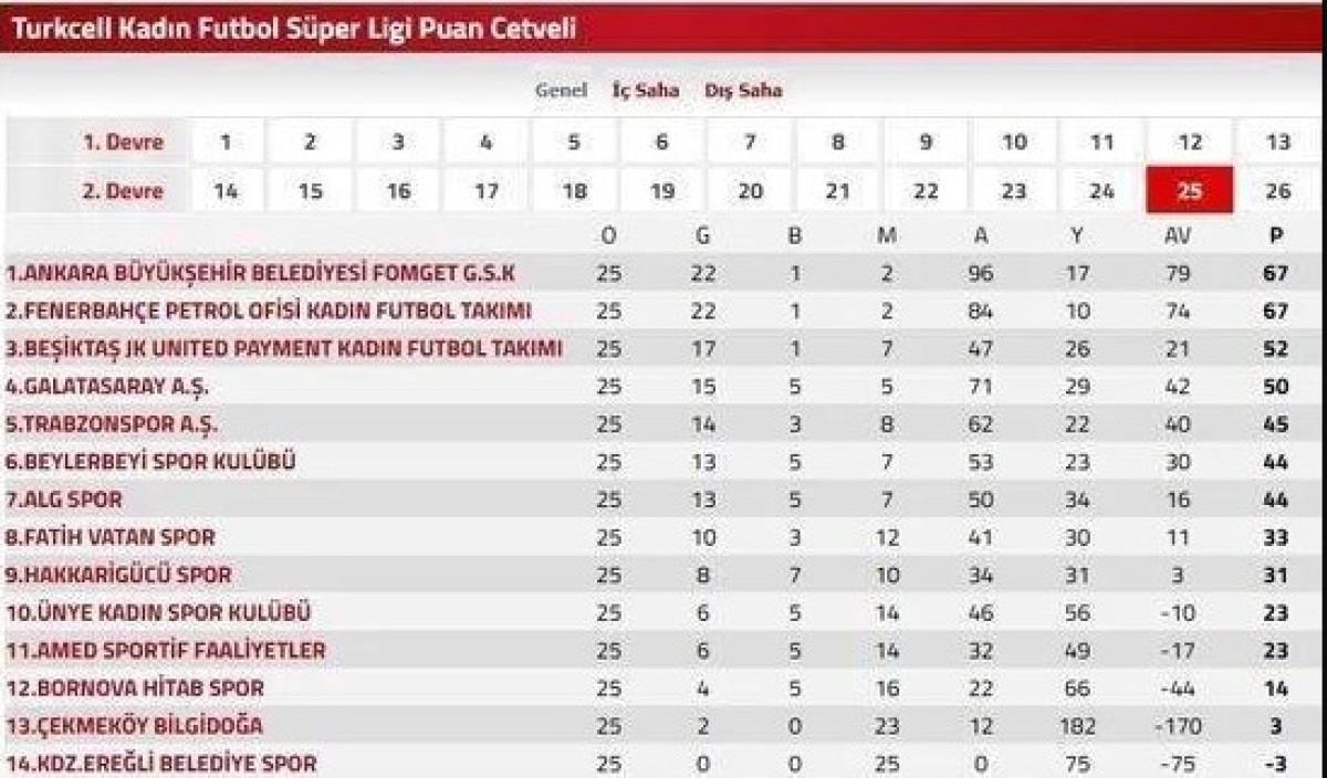 Kadınlar Futbol Ligi'nde Fomget ve Fenerbahçe'nin 67'şer puanı bulunuyor. Fomget'in ligde 79, Fenerbahçe'nin ise 74 averajı bulunuyor.
