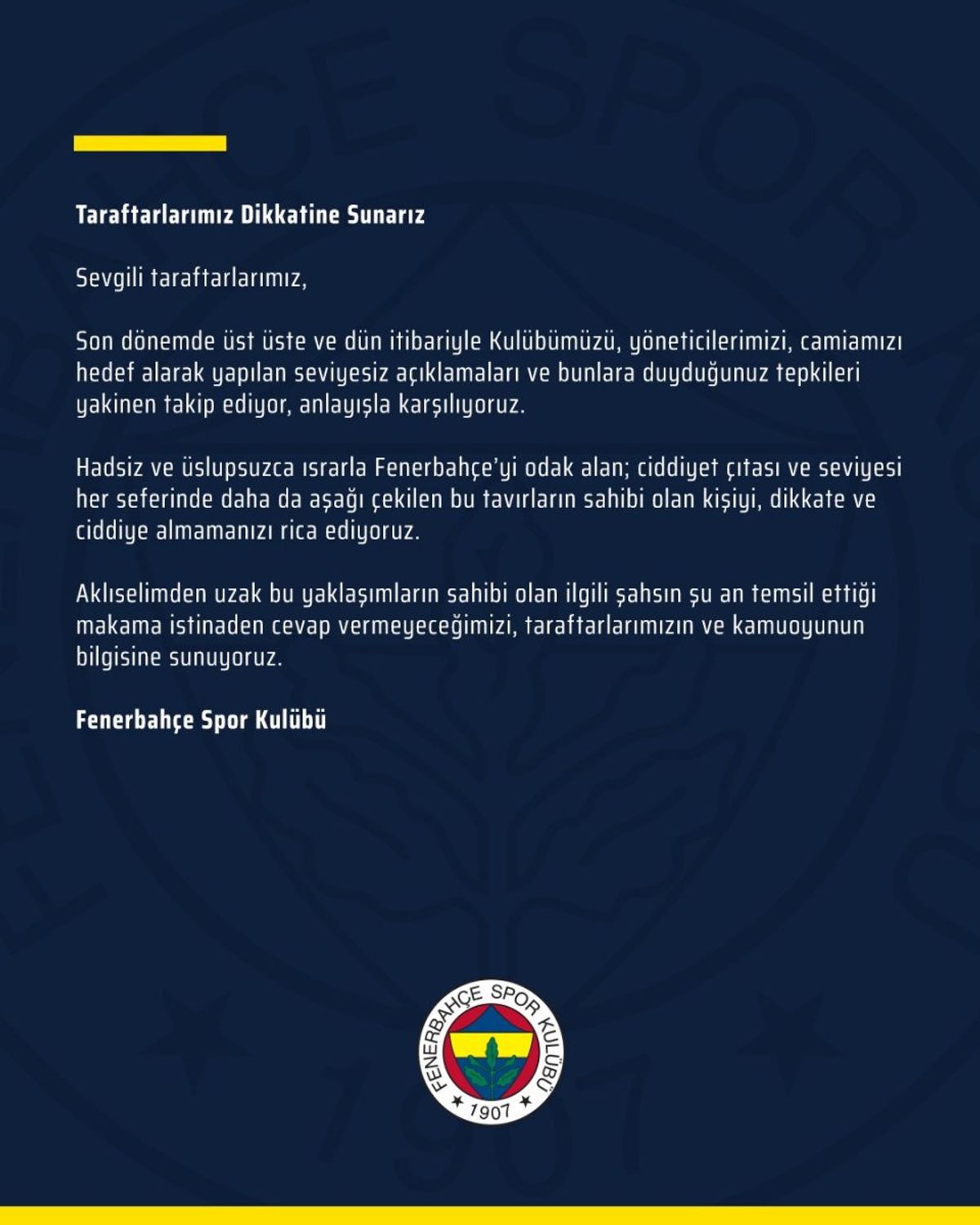 "Sevgili taraftarlarımız, Son dönemde üst üste ve dün itibariyle Kulübümüzü, yöneticilerimizi, camiamızı hedef alarak yapılan seviyesiz açıklamaları ve bunlara duyduğunuz tepkileri yakinen takip ediyor, anlayışla karşılıyoruz.