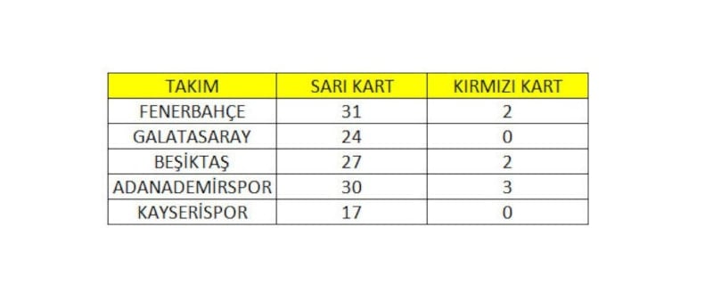 Ayrıca ilk 13 haftalık lig yarışına ilişkin sarı kart kırmızı kart verileri de aşağıdaki şekildedir.