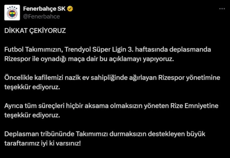 Futbol Takımımızın, Trendyol Süper Ligin 3. haftasında deplasmanda Rizespor ile oynadığı maça dair bu açıklamayı yapıyoruz.