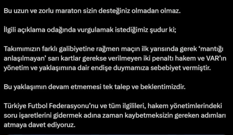 Takımımızın farklı galibiyetine rağmen maçın ilk yarısında gerek 'mantığı anlaşılmayan' sarı kartlar gerekse verilmeyen iki penaltı hakem ve VAR'ın yönetim ve yaklaşımına dair endişe duymamıza sebebiyet vermiştir.