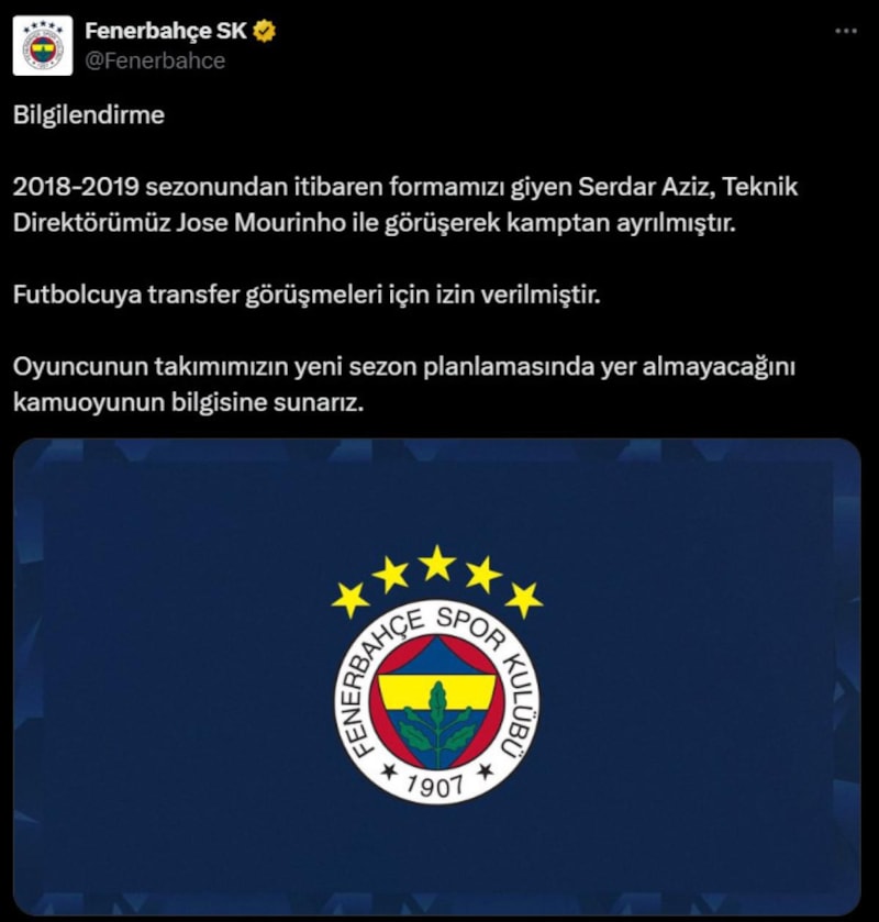 Fenerbahçe, 2018-2019 sezonunda bu yana sarı-lacivertli formayı giyen Serdar Aziz'in Jose Mourinho ile görüşerek Avusturya kampından ayrıldığını duyurdu. Kulüpten yapılan açıklamada, milli futbolcunun transfer görüşmeleri yapacağı belirtildi.