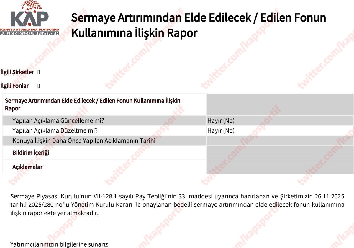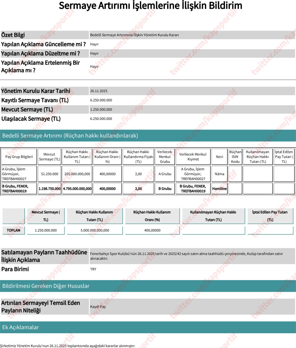 - Fenerbahçe, sermayesini 1 milyar 250 milyon liradan 6 milyar 250 milyon liraya artırma kararı aldı.
