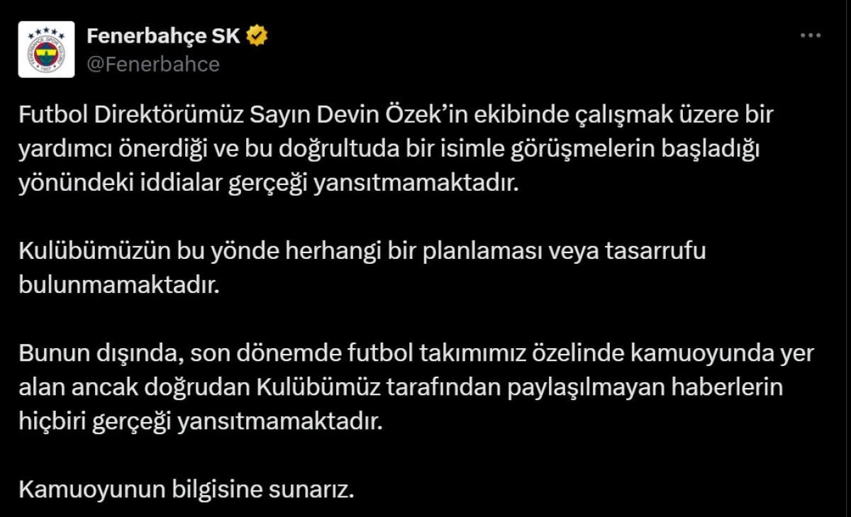 Bu gelişme üzerine Fenerbahçe, Özek'in kendisine bir yardımcı aradığı ve görüşmelerin başladığı yönünde şeklinde çıkan haberleri yalanladı.
