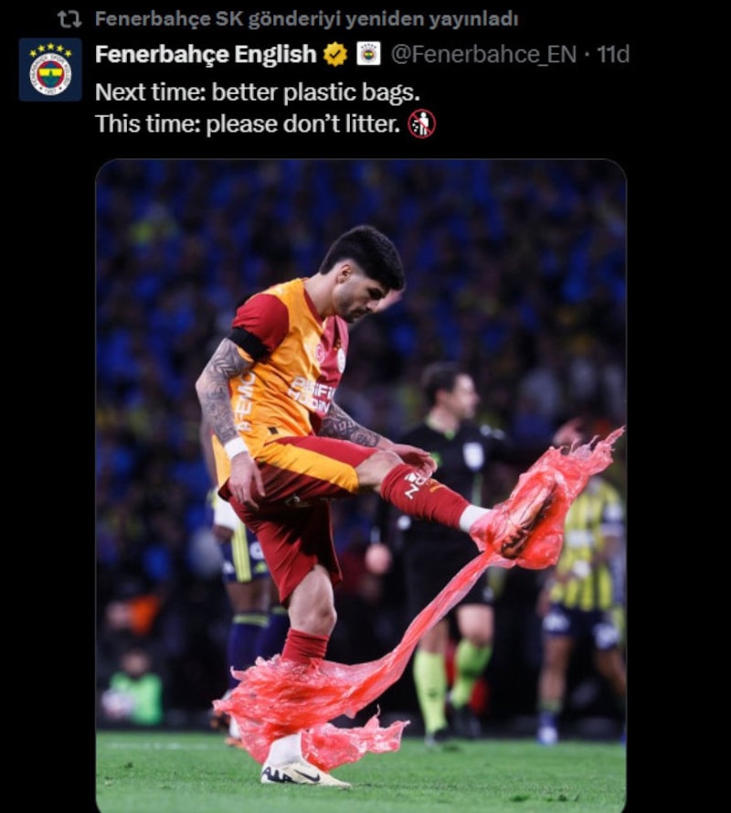 Fenerbahçe'nin İngilizce hesabı ise maçın ardından "Bir dahaki sefere: daha iyi plastik poşetler. Bu sefer: lütfen çöp atmayın" paylaşımını yaptı.