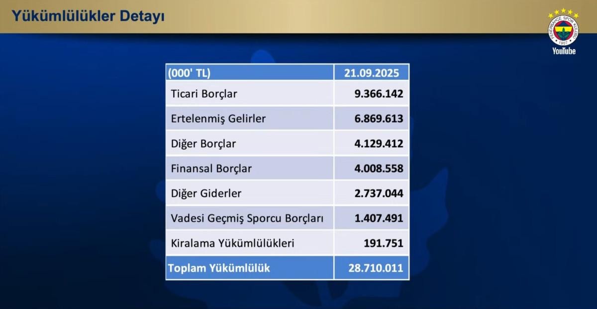 - Fenerbahçe Spor Kulübü'nün 2025 Eylül itibarıyla toplam borcu 28 milyar 710 milyon TL olarak açıklandı.