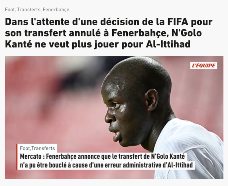 Suudi Arabistan ekibi Al-Ittihad'ın sisteme belgeleri hatalı yüklemesi sebebiyle transferi ilk etapta yetişmeyen Kante, Fenerbahçe'de oynamak için Suudi ekibine rest çekti.
