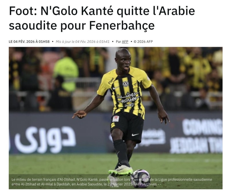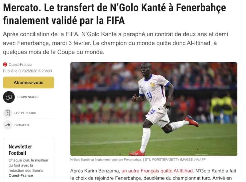 "Sonunda N'Golo Kante, Suudi Arabistan futbolunu bırakıp Fenerbahçe'ye katılacak. Önceki gün belgelerin tesliminde yaşanan gecikme nedeniyle ortaya çıkan ve Türk kulübünün Al-İttihad'ı sert bir şekilde eleştirmesine yol açan sorunların ardından, FIFA'nın Salı günü öğleden sonra operasyona yeşil ışık yaktığı bildirildi."