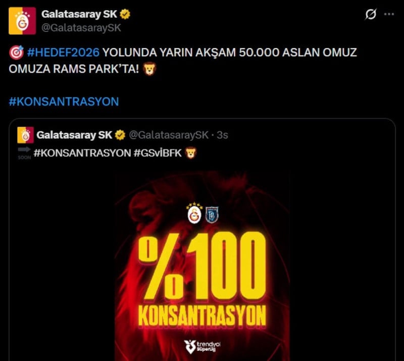 Galatasaray'ın paylaşımında, "HEDEF2026 YOLUNDA YARIN AKŞAM 50.000 ASLAN OMUZ OMUZA RAMS PARK'TA!" ifadeleri kullanıldı.