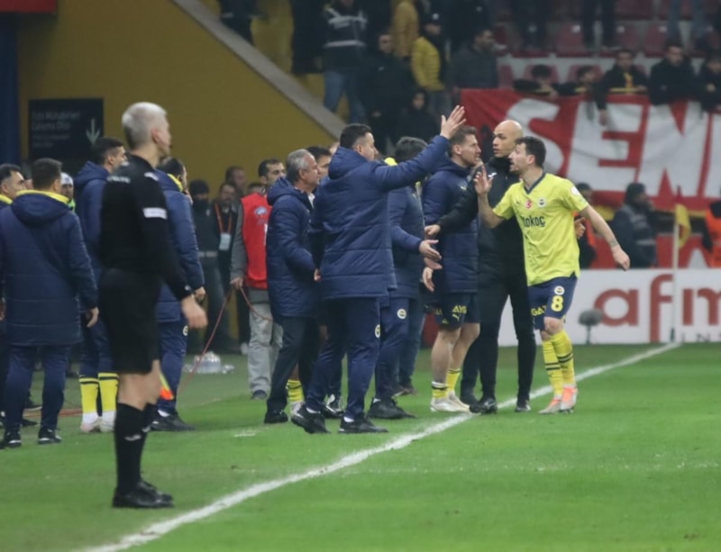 Mert Hakan Yandaş ve Fred hakeme itiraz edince iki oyuncu üst üste sarı kart gördü.