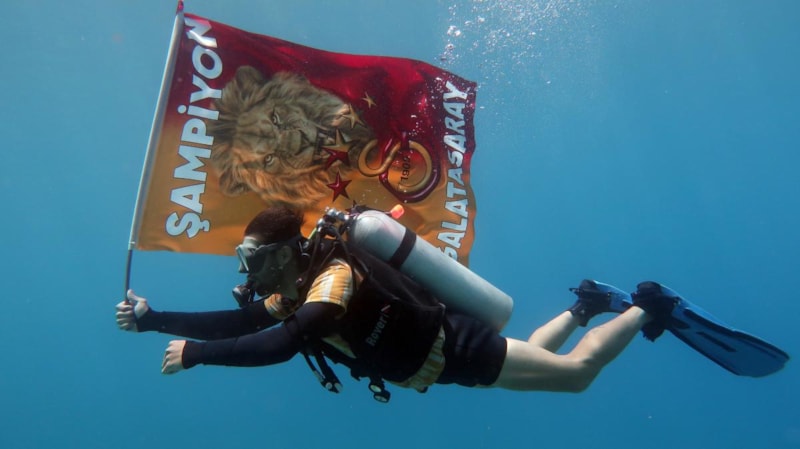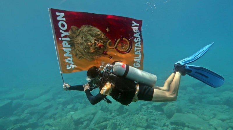 Sarı-kırmızıların 25. şampiyonluğunu kazanması sebebiyle Muğla'nın Fethiye ilçesinde bir grup dalgıç, deniz dibinde sarı-kırmızılı Galatasaray bayraklarıyla resmi geçit gerçekleştirdi.