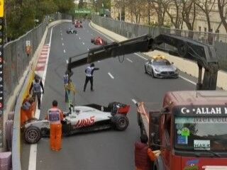 Azerbaycan Grand Prix'sinde kaza yapan Haas F1 takımı pilotu Romain Grosjean'in aracını pistten çıkarmak için gelecen çekicinin ön tarafında yazan "Allah korusun" yazısı dikkatlerden kaçmadı.