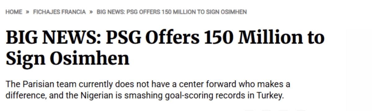 Fichajes, Fransa'nın ünlü kulübü PSG'nin Osimhen için yaklaşık 150 milyon euroluk bir teklif yapmaya hazırlandığını duyurdu.