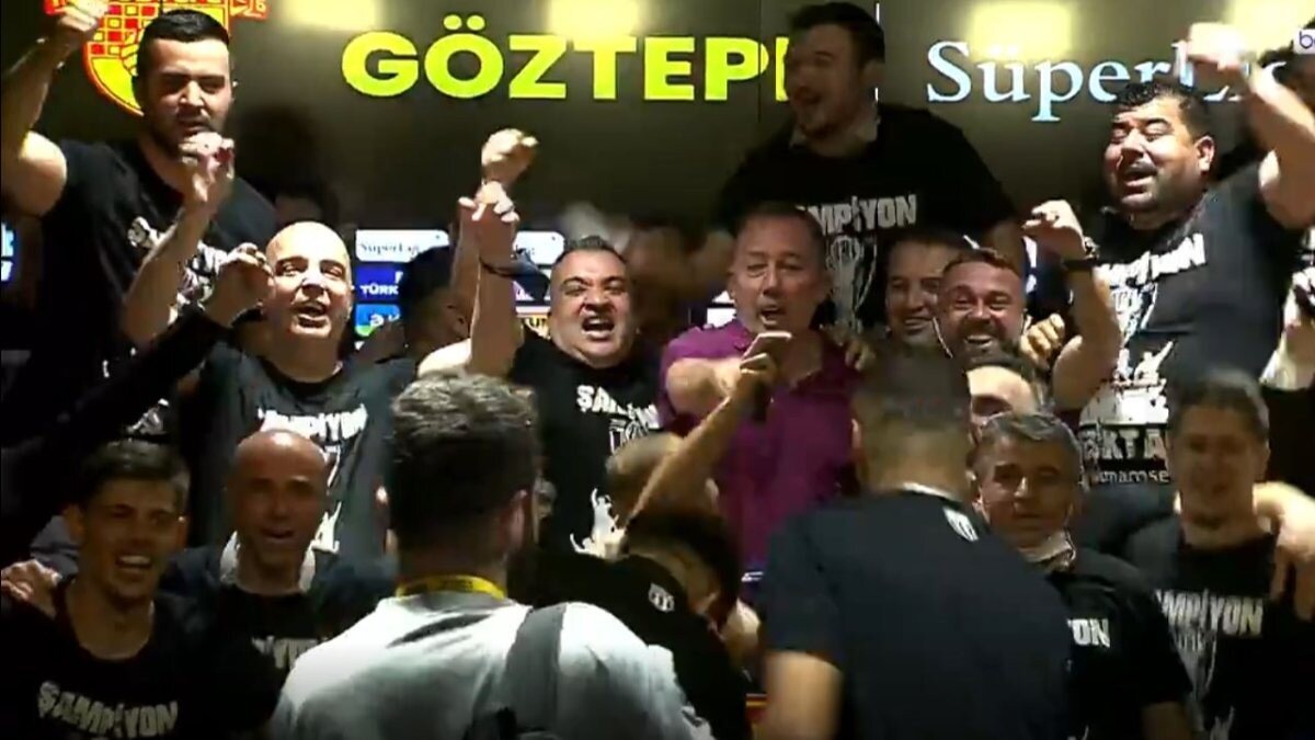 Şampiyonluğun ardından başarının mimarı teknik direktör Sergen Yalçın da basın mensuplarının karşısına geçerken futbolcular bu sırada basın toplantısını bastı.
