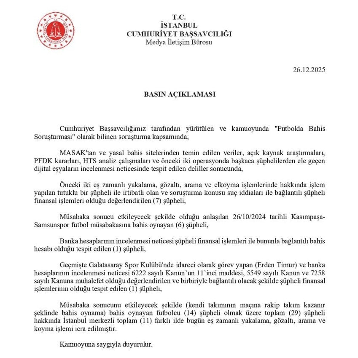 Önceki iki eş zamanlı yakalama, gözaltı, arama ve el koyma işlemlerinde hakkında işlem yapılan tutuklu bir şüpheli ile irtibatlı olan ve soruşturma konusu suç iddiaları ile bağlantılı şüpheli finansal işlemleri olduğu değerlendirilen 7 şüpheli, müsabaka sonucu etkileyecek şekilde olduğu anlaşılan 26/10/2024 tarihli Kasımpaşa-Samsunspor futbol müsabakasına bahis oynayan 6 şüpheli, banka hesaplarının incelenmesi neticesi şüpheli finansal işlemleri ile bununla bağlantılı bahis hesabı olduğu tespit edilen TFF'de görevli 1 şüpheli, geçmişte Galatasaray Spor Kulübü'nde idareci olarak görev yapan Erden Timur ve banka hesaplarının incelenmesi neticesi 6222 sayılı Kanun’un 11’inci maddesi, 5549 sayılı Kanun ve 7258 sayılı Kanuna muhalefet olduğu değerlendirilen ve birbiriyle bağlantılı olacak şekilde şüpheli finansal işlemlerinin olduğu tespit edilen 1 şüpheli, müsabaka sonucunu etkileyecek şekilde (kendi takımının maçına rakip takım kazanır şeklinde bahis oynama) bahis oynayan futbolcu (14) şüpheli olmak üzere toplam (29) şüpheli hakkında İstanbul merkezli toplam 11 farklı ilde bugün eş zamanlı yakalama, gözaltı, arama ve koyma işlemi icra edilmiştir. Kamuoyunun bilgisine sunulur."