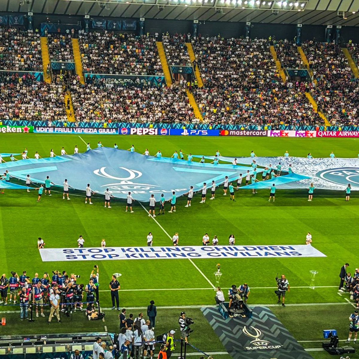 Tepkileri dindirmek isteyen UEFA, 13 Ağustos'ta Paris St Germain ile Tottenham arasında oynanan Süper Kupa finalinde "Çocukları, sivilleri öldürmeyi durdurun." pankartı açarken Başkan Aleksander Ceferin, madalya seremonisine iki Filistinli çocukla katıldı.
