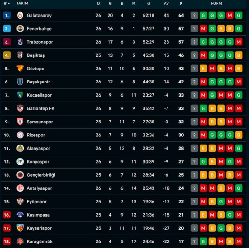 Galatasaray, Süper Lig'de 25 haftada 19 galibiyet, 4 beraberlik ve 2 yenilgiyle 61 puan toplayarak 26. haftaya en yakın rakibi Fenerbahçe'nin 4 puan önünde lider girdi.