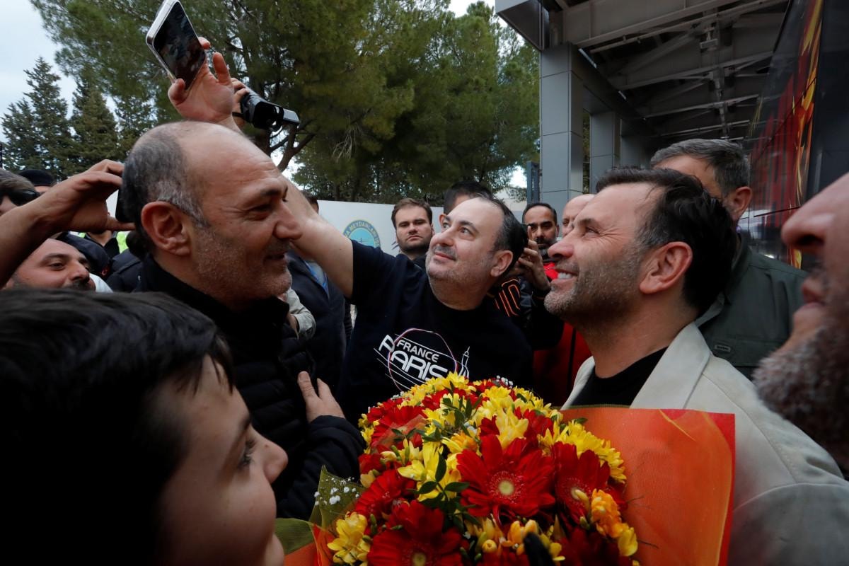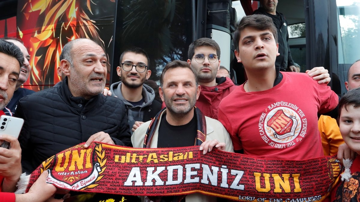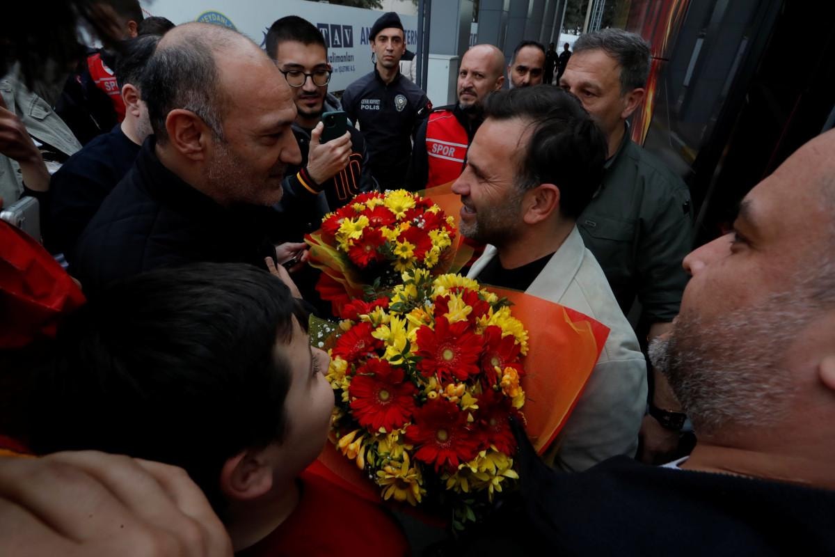 Havaalanı VIP girişinde bekleyen taraftarlar takım otobüsünü durdurarak teknik direktör Okan Buruk'a çiçek takdim etti.