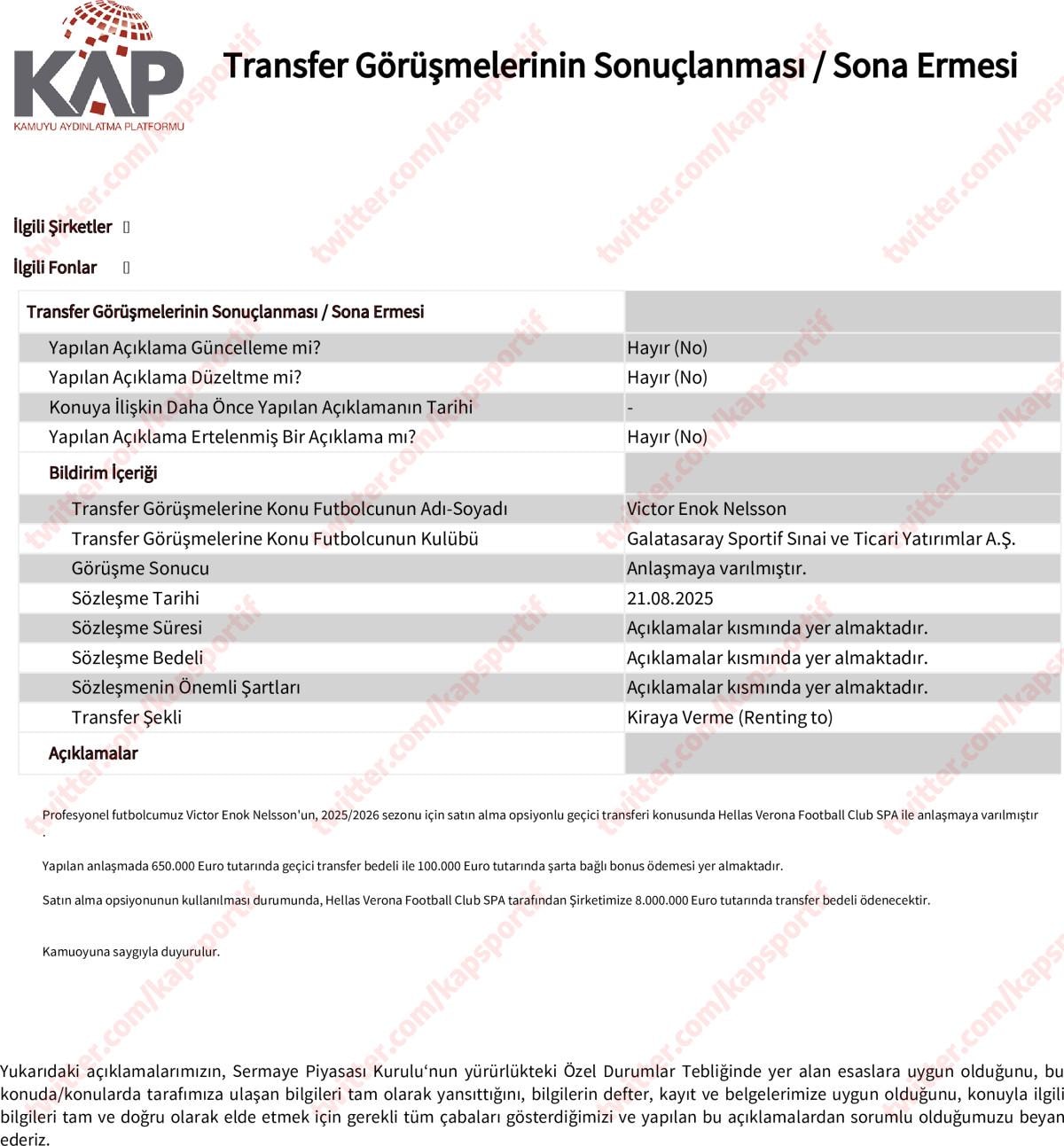 Profesyonel futbolcumuz Victor Enok Nelsson'un, 2025/2026 sezonu için satın alma opsiyonlu geçici transferi konusunda Hellas Verona Football Club SPA ile anlaşmaya varılmıştır.