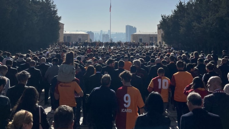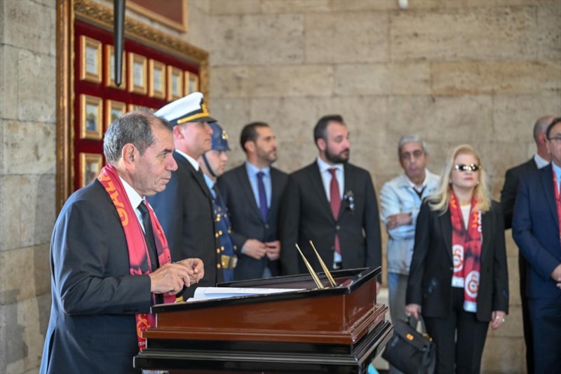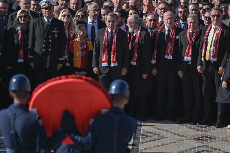 Sarı-kırmızılı heyet, Aslanlı Yol'dan yürüyerek Atatürk'ün mozolesine geldi. Dursun Özbek'in, mozoleye çelenk bırakmasının ardından saygı duruşunda bulunuldu.