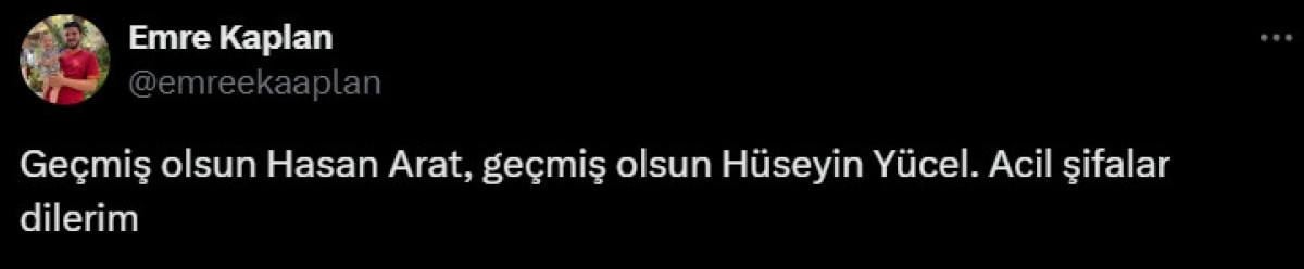Spor muhabiri Emre Kaplan, Galatasaray'ın 2-1'lik galibiyeti sonrasında sosyal medya hesabından "Geçmiş olsun Hasan Arat, geçmiş olsun Hüseyin Yücel. Acil şifalar dilerim" ifadelerini kullandı.