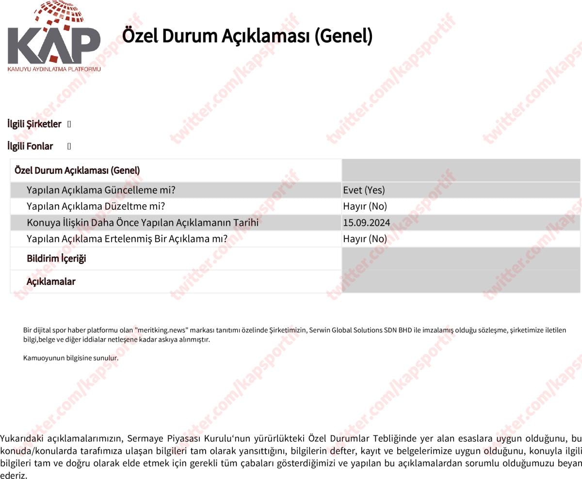 Bir dijital spor haber platformu olan "meritking.news" markası tanıtımı özelinde Şirketimizin, Serwin Global Solutions SDN BHD ile imzalamış olduğu sözleşme, şirketimize iletilen bilgi,belge ve diğer iddialar netleşene kadar askıya alınmıştır.