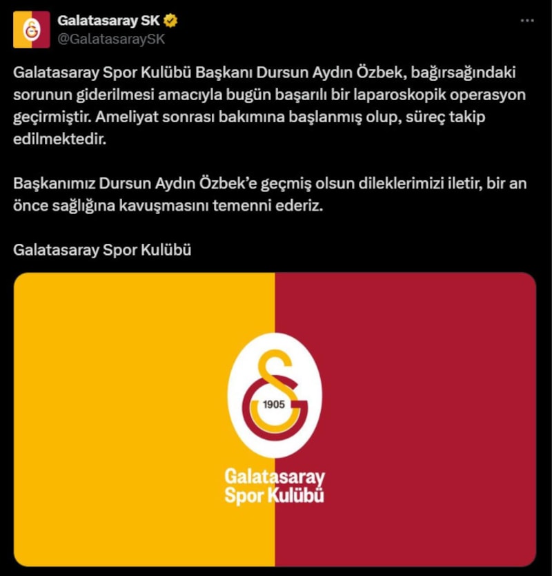 Sarı-kırmızılılar, Özbek'in başarılı bir laparoskopik operasyon geçirdiğini duyurdu ve geçmiş olsun dileğinde bulundu.