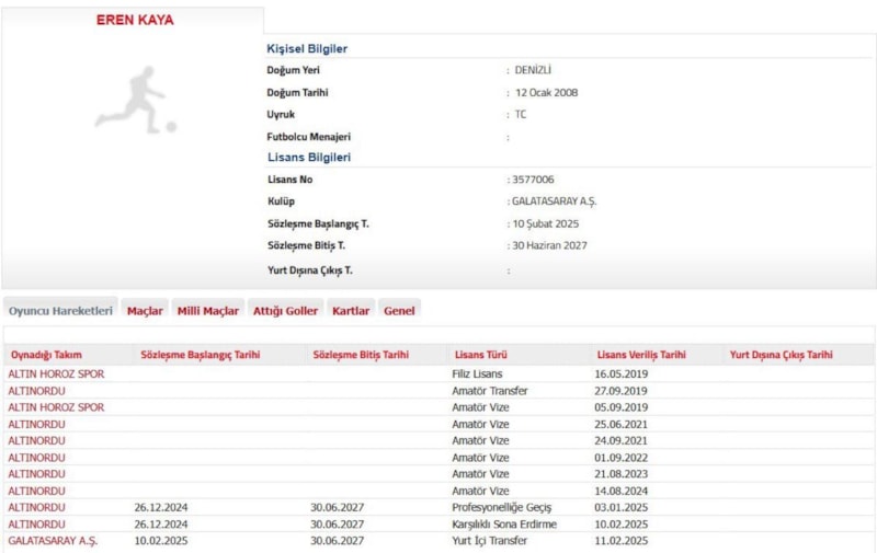 Galatasaray, Altınordu'dan transfer edilen 17 yaşındaki sol bek oyuncusu Eren Kaya'nın lisansını çıkarttı.