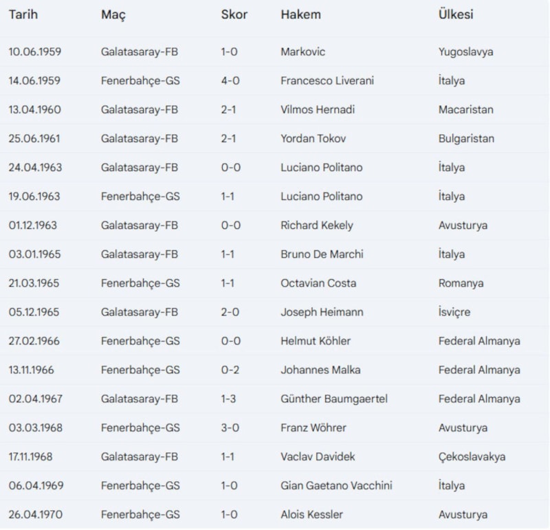 1959'dan bu yana Süper Lig'de yabancı hakemleri yönettiği Galatasaray-Fenerbahçe derbileri şöyle: