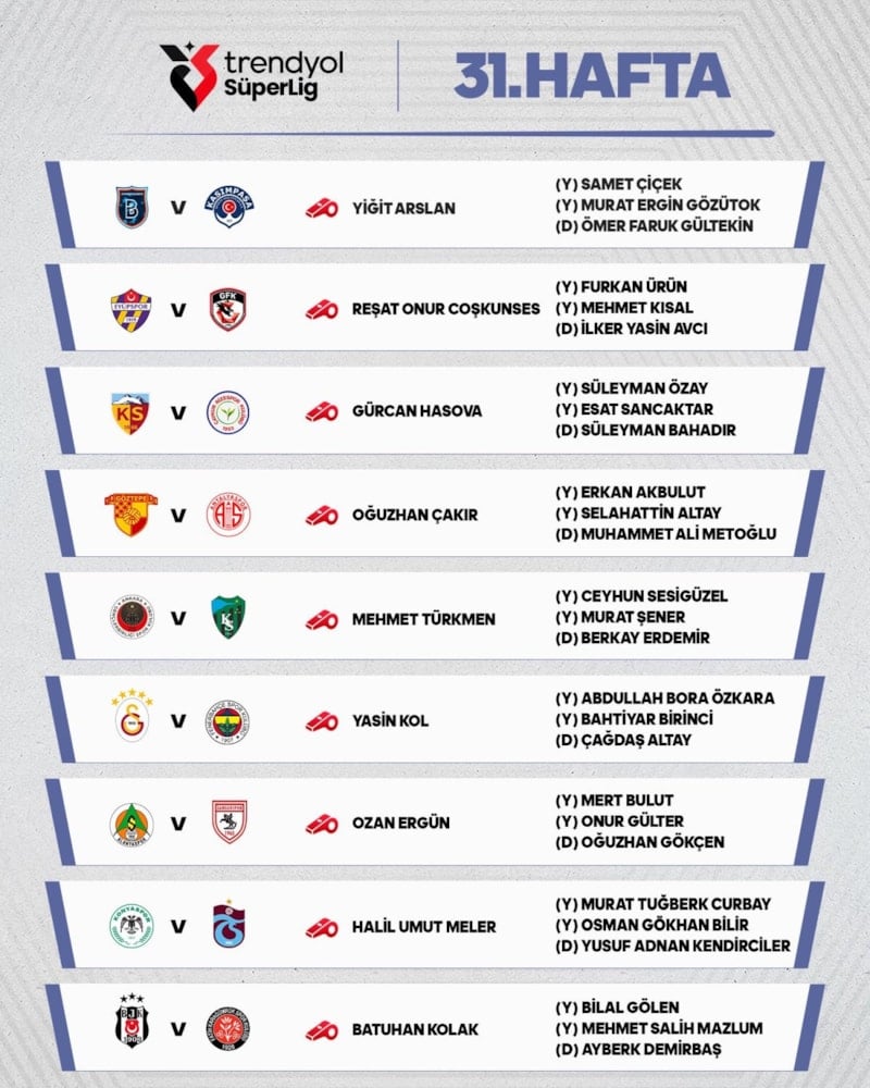 Süper Lig'in 31. haftasında oynanacak müsabakalarda düdük çalacak hakemler açıklandı. Buna göre, Galatasaray ile Fenerbahçe arasındaki derbi mücadelesini Yasin Kol yönetecek.