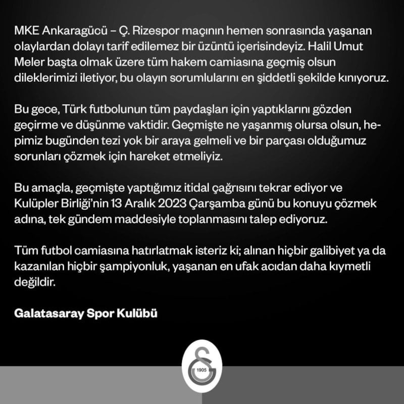 Galatasaray'dan yapılan açıklamada, "Bu gece, Türk futbolunun tüm paydaşları için yaptıklarını gözden geçirme ve düşünme vaktidir. Geçmişte ne yaşanmış olursa olsun, hepimiz bugünden tezi yok bir araya gelmeli ve bir parçası olduğumuz sorunları çözmek için hareket etmeliyiz" denildi.