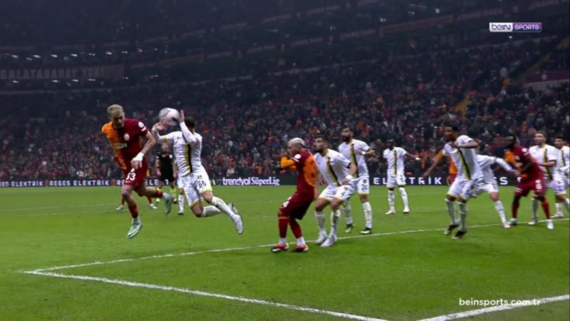 Galatasaray cephesi gol öncesi İstanbulspor ceza sahası içerisinde bir elle oynama itirazında bulundu ve VAR uyarısı geldi.