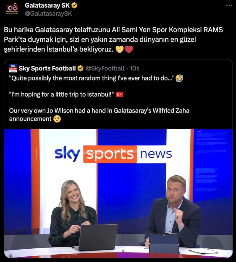 Sky Sports ünlü muhabiri Jo Wilson, Zaha transferi sonrası canlı yayında Galatasaray kulübünden davet beklediğini açıklamıştı. Wilson'un özellikle 'Galatasaray' telaffuzu çok konuşuldu.