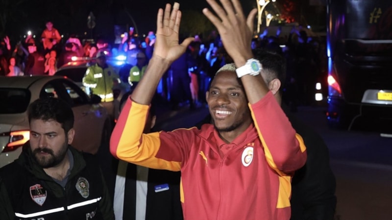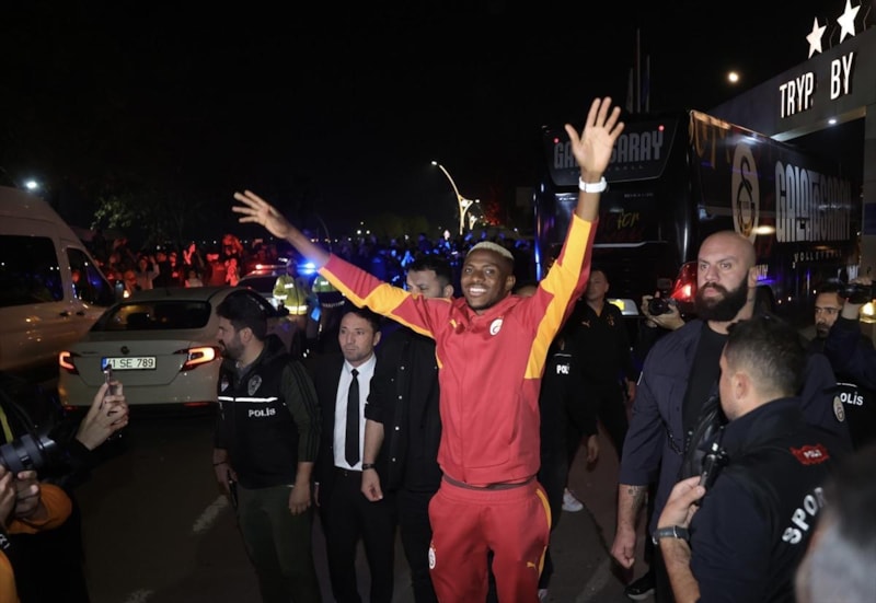 Süper Lig maçı için Kocaeli'ye giden Galatasaray'da Victor Osimhen, otel önünde bekleyen taraftarları selamlayarak tezahürat yaptırdı.