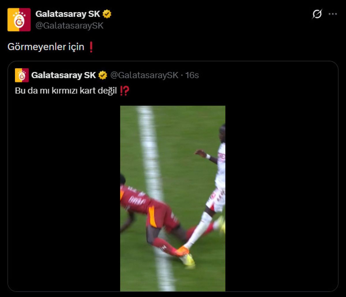 - Galatasaray, Samsunspor maçında kırmızı kart beklediği pozisyonun görüntülerini sosyal medyada paylaştı.
