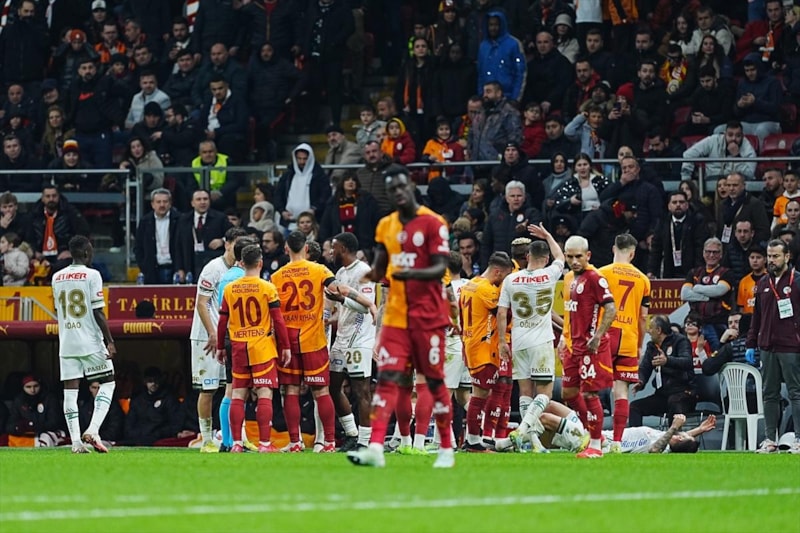 18' Osimhen, rakip ceza sahasında Adil ile girdiği ikili mücadele sonrası yerde kaldı. Galatasaraylı futbolcular hakem Halil Umut Meler'e penaltı itirazlarında bulunuyor...